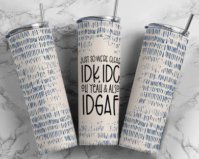 Just so we're clear IDK, IDC and IDGAF 20 oz Tumbler Sublimation Transfer